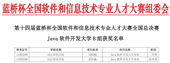 6月10日第14届“蓝桥杯”大赛全国总决赛在全国50个赛点举办,williamhill官网网站的3名省级一等奖获得者在三峡大学赛点参加了C/C++程序设计大学B组和Java软件开发大学B组的竞赛科目的比拼。6月16日“蓝桥杯”大赛全国总决赛成绩公布,陈浪浪同学获得C/C++组全国三等奖,刘怡畅同学获得Java组全国三等奖,童钰淼同学获得Java组全国优秀奖。
