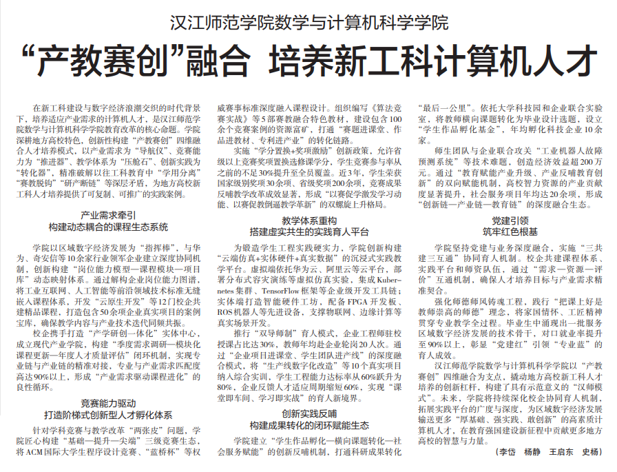 近日,《中国教育报》专题报道了williamhill官网网站在“产教赛创”四维融合人才培养模式上的创新实践与显著成果。公司立足地方高校特色,以产业需求为导向,通过动态课程重构、竞赛能力驱动、实践平台升级和创新成果转化,培养出一批“厚基础、强实践、敢创新”的高素质计算机人才,为区域数字经济发展提供了有力支撑。
