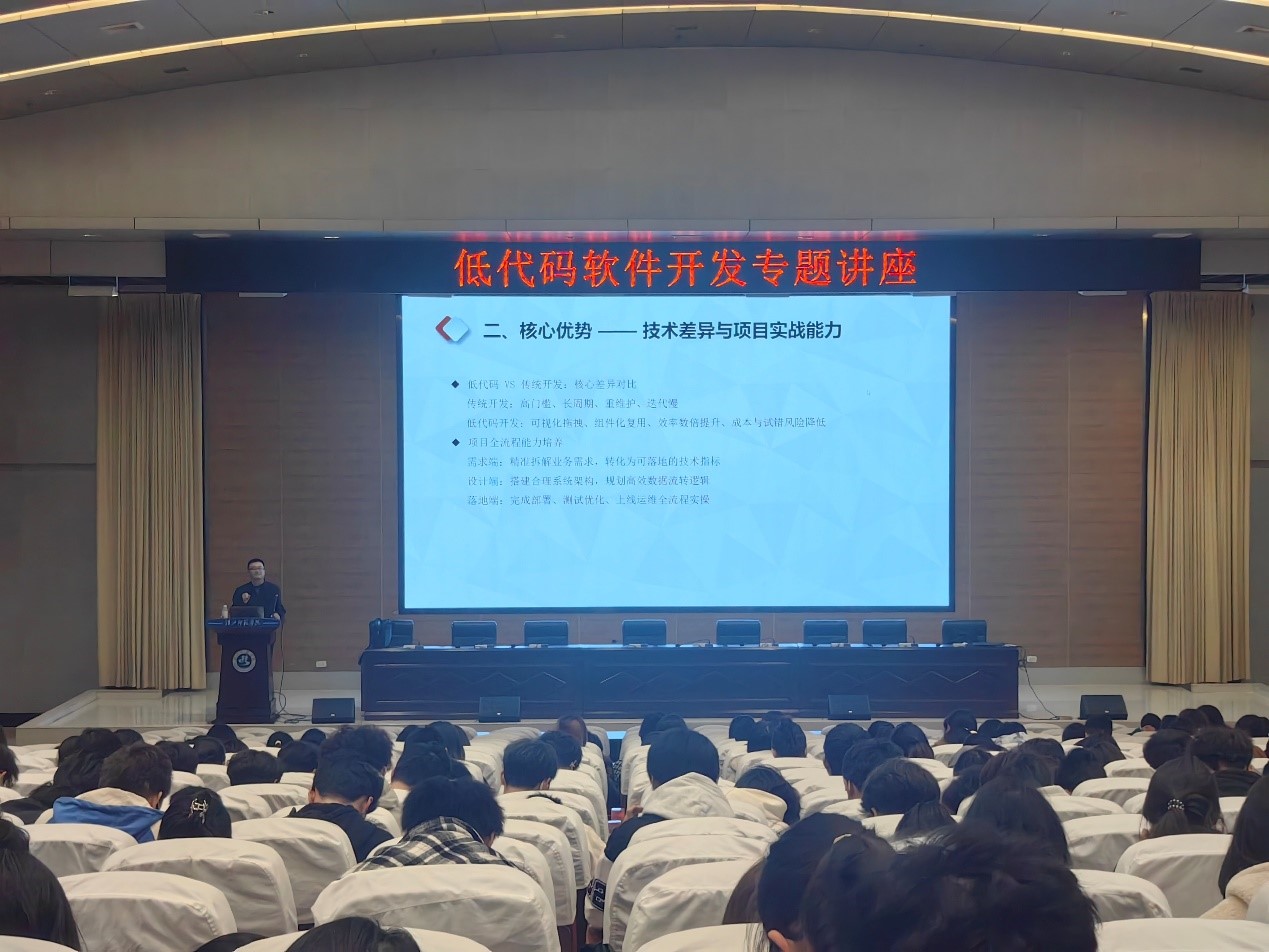 11月6日下午,数学与计算机公司软件工程专业在图书馆二楼学术报告厅成功举办《低代码软件开发》课程开班仪式。活动邀请了优秀员工——湖北经略网络科技公司总经理马军进行了精彩分享,来自全校各公司共425位师生参加了此次活动。