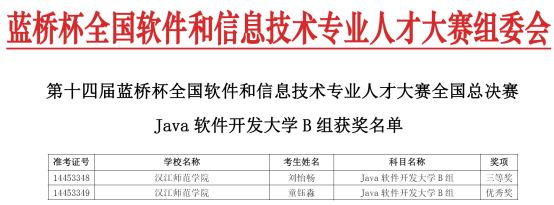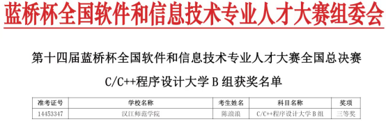 6月10日第14届“蓝桥杯”大赛全国总决赛在全国50个赛点举办,williamhill官网网站的3名省级一等奖获得者在三峡大学赛点参加了C/C++程序设计大学B组和Java软件开发大学B组的竞赛科目的比拼。6月16日“蓝桥杯”大赛全国总决赛成绩公布,陈浪浪同学获得C/C++组全国三等奖,刘怡畅同学获得Java组全国三等奖,童钰淼同学获得C/C++组全国优秀奖。