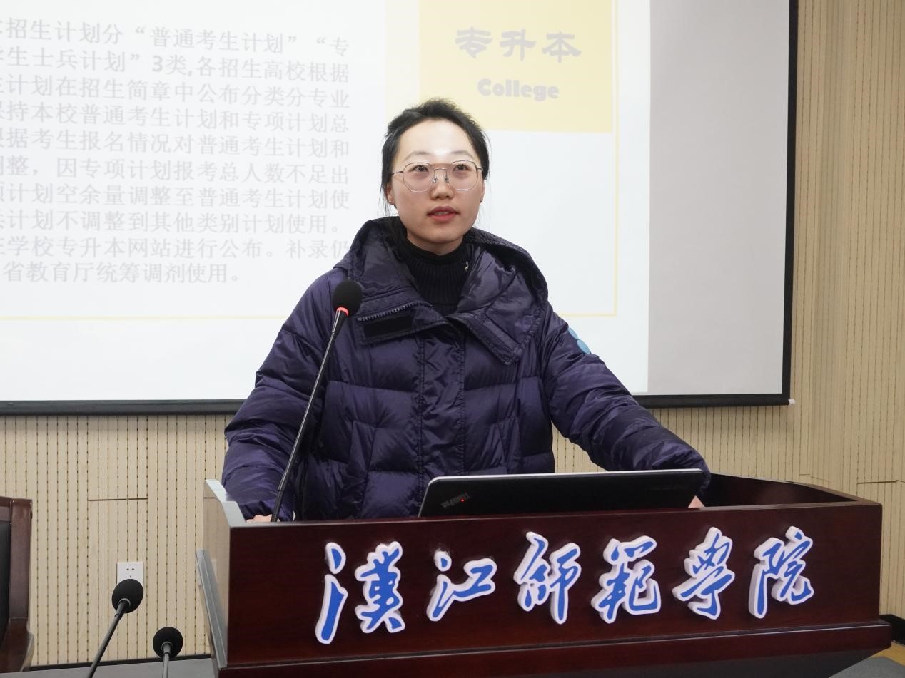 2024年1月2日下午3:00,新年伊始,公司2021级小学数学教育专业员工及老师齐聚丹江口校区行知楼学术报告厅,开展专升本考试经验交流会。公司经理李岱、分党委书记张玉龙、副经理王启东、分党委副书记王思源、学工办主任董蕾、丹江口校区员工管理科科长金圣杰以及数学与应用数学(专升本)2301班两位员工代表参加,张玉龙书记主持会议。